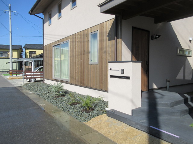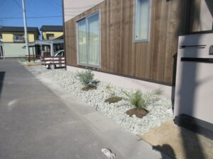 道路境界部の植栽帯は小栗石敷き込みとなります。石屋さんから持ってきたものは土やほこりがついていて白くなっていたので表面をしっかりと水洗いしたら良い感じになりましたね(≧▽≦) 河口さん、村崎さんコンビで頑張ってくれました。最後は天然芝部にもお水をあげて完了!明日以降、屋内間仕切りのガラス入れ、コーキング打ちなど。6日までには屋内も完了を目指します!K様、最後まで引き続きよろしくお願い致します。