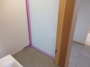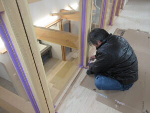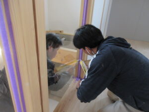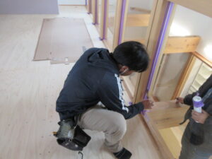 仕上コーキング工事は、Kイ・オーのHさんコンビです。各部材の取り合いやガラス止めのコーキングをやってくれました!残すは、河口さんの家具取付(棚柱や移動棚)を週末までに終わらせてくれると思います。K様、最後まで引き続きよろしくお願い致します。