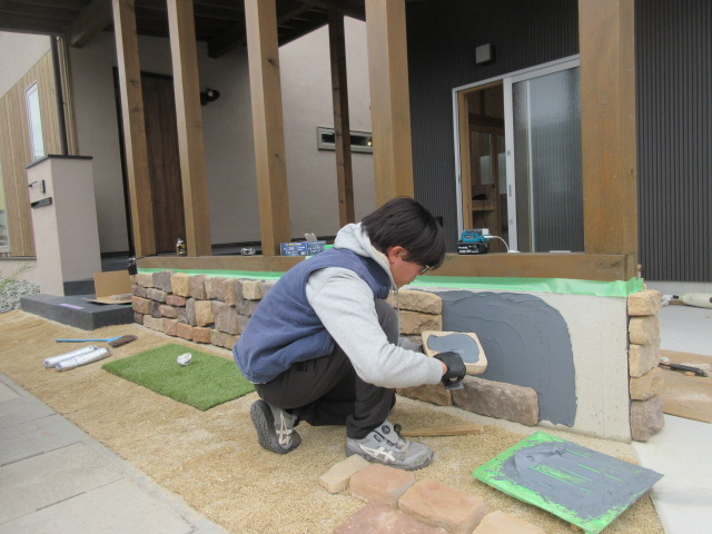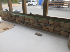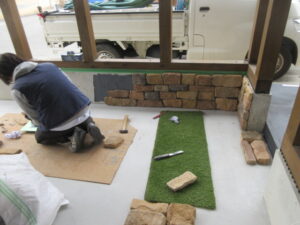 河口さんが倉庫棟の基礎巾木の擬石(軽量モルタルで造った擬石)をタイルボンドで貼ってくれました(*^▽^*) DIYみたいですが、張ったら感じよくなりましたよ~