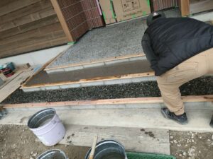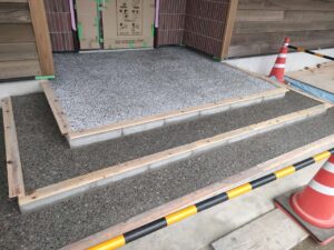 外部の左官工事。K林工業さんに、玄関ポーチの階段部の玉石の洗い出し仕上げを進めて頂きました。これから、自然に乾燥していくと、一段目のように、目地材が白っぽくなり、玉石が浮き上がって見えてきますよ。