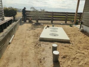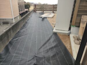 外構工事では、村﨑さんにより、東側スペースの整地、転圧、防草シート張りが進められています。これから、砂利敷きも進んでいきますよ。