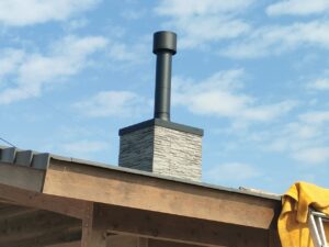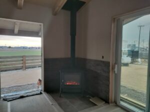 薪ストーブ工事では、薪ストーブから屋根の上への煙突が出来ました。内部の薪ストーブ本体設置も完了しました。そして、火入れして試運転。暖かいです~。見ていてもなんとなく癒されますね。