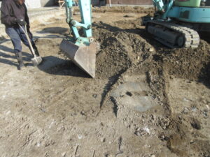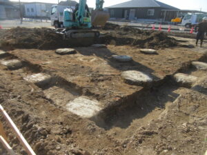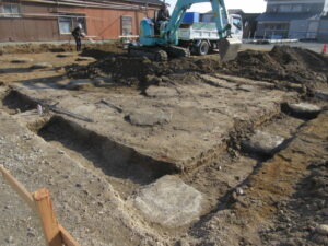 土工事、基礎工事は、K田工業さんです。3人さんですきとり工事開始です。外周基礎根切、ベタ土間下砕石含めてのすきとり作業です。明日も引き続きすきとり作業です。T様、これから本格的に基礎工事が始まります。引き続きよろしくお願い致します。