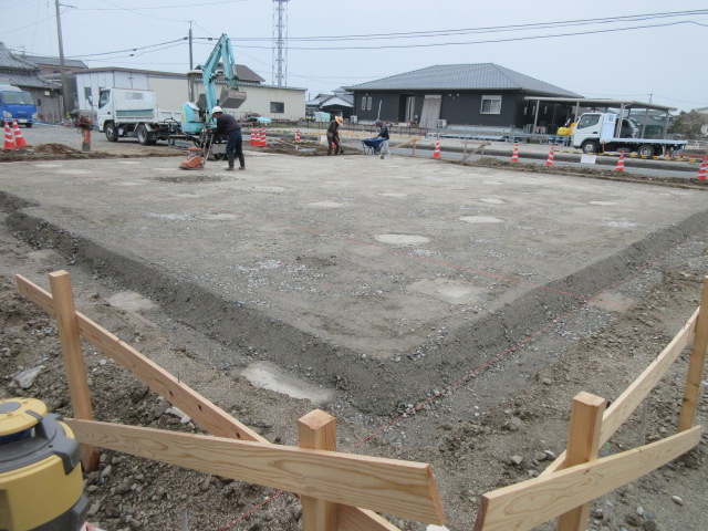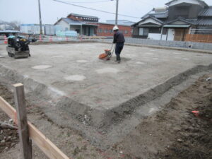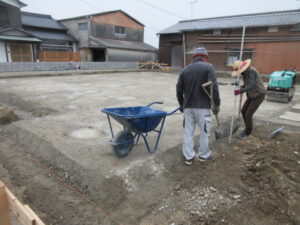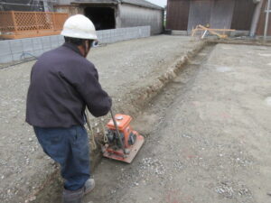今日も基礎工事は、K田工業のお三方。ベタ基礎下地の砕石入が完了。そして転圧。最後はレベルの調整をしています。明日は、シロアリ予防の土壌処理を行い、午後からは捨てコン打設まで行く予定です。T様、引き続きよろしくお願い致します。