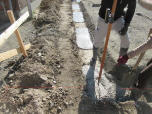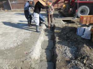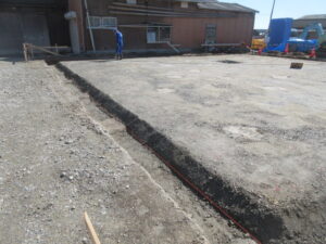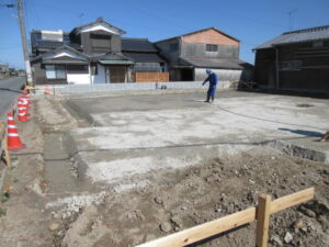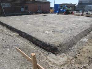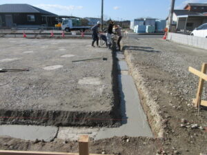 基礎工事は、K田工業のお三方!今日は外周廻りの枠建て用の捨てコン打設です。明日、外枠の墨出しをしてから外枠建てが始まります。建て込み完了後に防湿フィルム敷き、その後配筋工事へと進みます。T様、引き続きよろしくお願い致します。