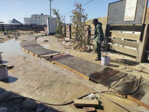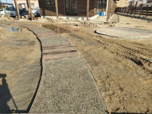 外構工事は遊歩道部分が仕上がってきました。枕木と枕木の間は、玉砂利を練り込んだモルタルをきれいに塗りあげ、しばらくして、玉砂利が表面に出るように、洗い出しして仕上げています。