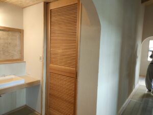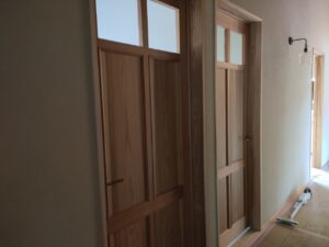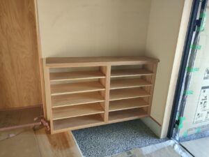 建具の取付、造作家具の下足箱、洗面下の棚の取付等が、進みました。