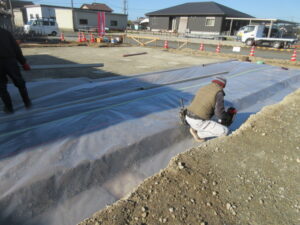 基礎工事は、K田工業さんです。今日は4人態勢で進めてくれています。朝イチから枠の墨出し、そいて防湿フィルム敷きです。