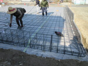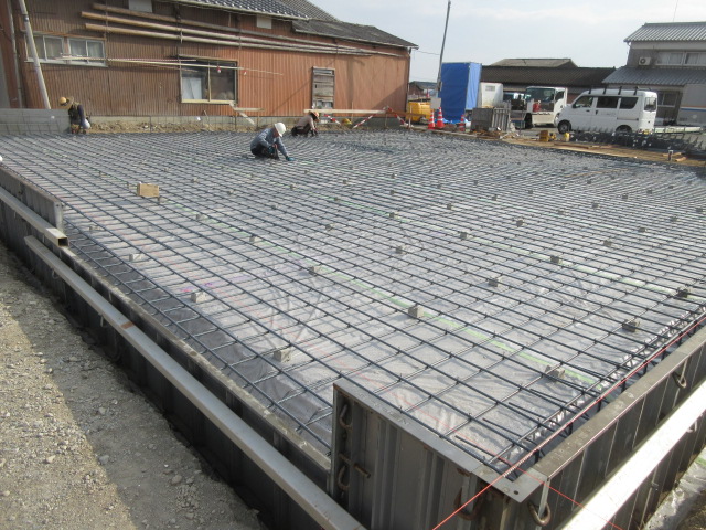 k礒浩二は、K田工業さんです。今日も4人態勢で進めてくれています。昨日に引き続き、配筋工事中です。土間止め枠が入ってきました。また、ベタ基礎配筋のD13-@200(タテヨコ)筋が終わり、明日から内部の立上り筋の配置へ進むようです。T様、引き続きよろしくお願い致します。