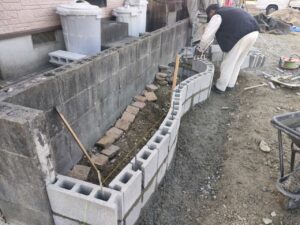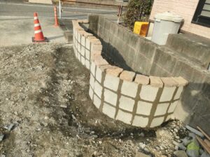 出入口の花壇工事が進んでいます。建物の前にできた花壇とは少し違う雰囲気の花壇に仕上がりそうです。
