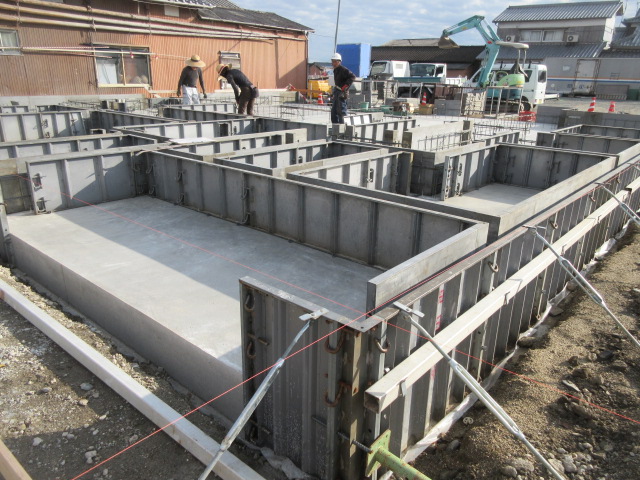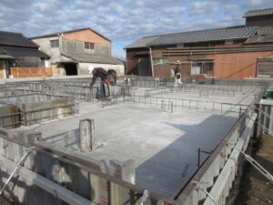 柳川市 T様邸新築工事 ですが昨日、ベタ基礎コンクリート打設が終わり、今日から立上り型枠組が始まりました!