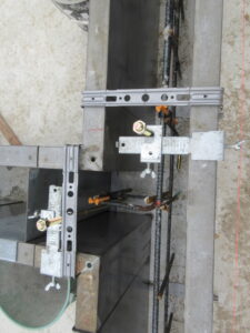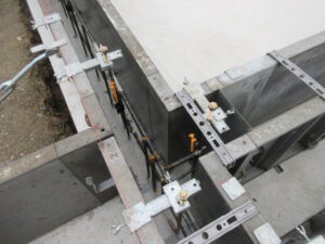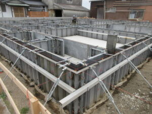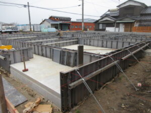 基礎工事は、K田工業さんのお三方です。型枠組完了後、アンカーボルトのセットから高さ出し。そしてオレンジの部材は基礎天端のレベル出しのためのものです。これを機械で高さを調整していき基礎天端のレベルをあわせます。今日は雨天のため、10時で撤収となり明日も引き続き、レベル出し、アンカーボルト位置の最終確認などをやって。水曜日には立上りコンクリート打設となります。T様、引き続きよろしくお願い致します。