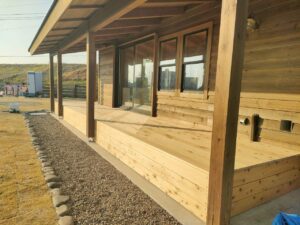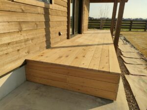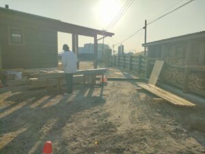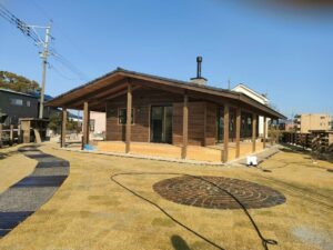 みやま市モデルハウス新築工事の現場では、デッキ工事や薪小屋工事が進められました。