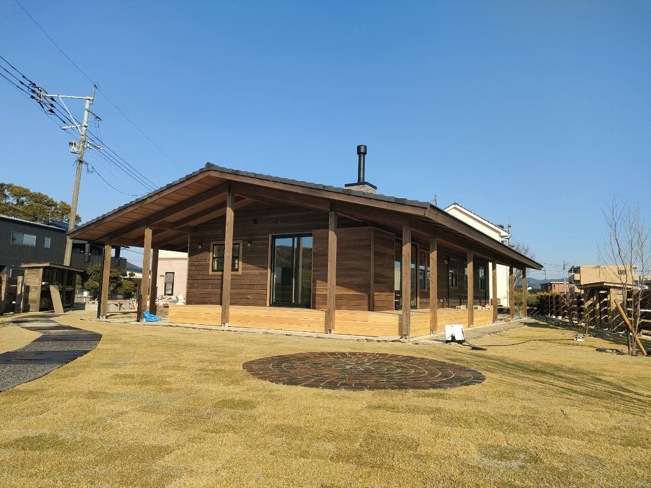 お庭の芝張りも完成し、これから、水やりが始まります。緑色一色になるのが楽しみですよね。