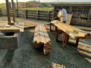 まだまだ、外部の木工事があります。この塗装されている木材は、どこにどう使用されるのでしょうか。