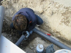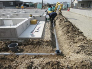 柳川市 T様邸新築工事 ですが、今日から基礎廻りの給排水管、雨水配管の布設工事が始まりました。