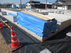 そして午後からは、キソパッキン、鋼製束、構造金物などが、ど~ん!っと入りましたこのブルーシートの中に入っています(*^▽^*) 最後に、基礎廻りに防草シートは張りました。これはおうちが建って雨が降ると雨が地面で跳ねて外壁や基礎の立上りを汚してしまうので予防のため(雨樋が付くまで)ものです(≧▽≦) T様、19日から土台を敷き始めます。お楽しみに~。