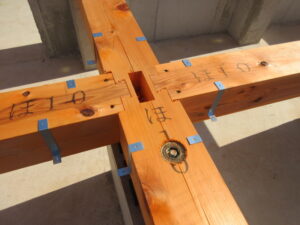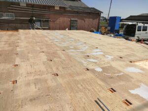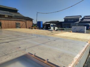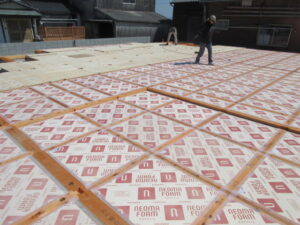 剛床合板張りが終わると、撥水剤を合板に塗ります。これは上棟前までに雨が降り浸水した時に合板が濡れない様にするためです。
