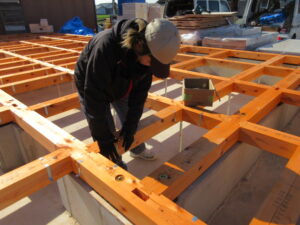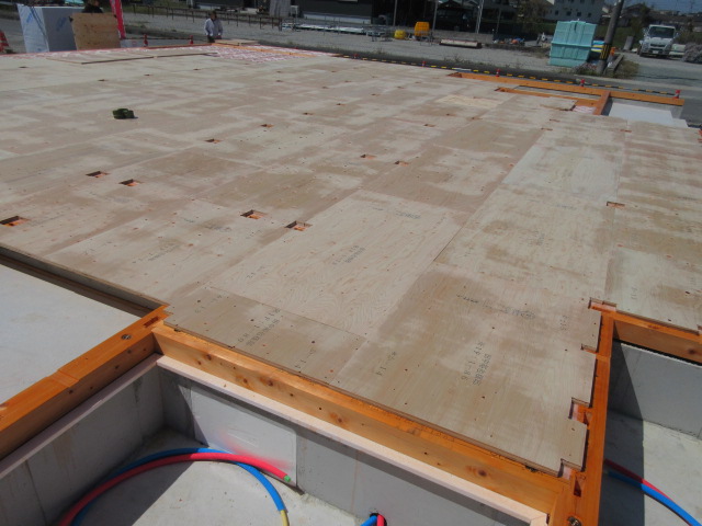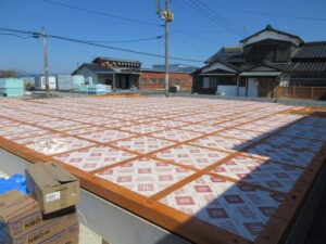 床下断熱材を入れたら気密テープをしっかりと貼り、床下の空気や虫の侵入も防ぎます!それが終わるといよいよ剛床合板張りです!