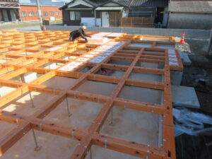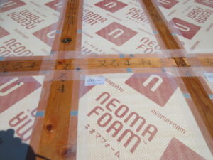 ピン入れが終われば床下断熱材を入れていきます。今はお願いすると指定の寸法にカットしてくれます。しっかりと番付けまであるので現場は助かります!