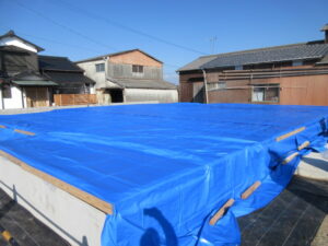 最後に床の養生(二重に)をします。ポリフィルム厚0.15mmを床の上に張り、継ぎ目にはしっかりと気密テープを張り雨水の侵入を防ぎます。そして最後に厚手のブルーシート10m×15mを2枚使用してしっかりと雨水の侵入を防ぎます。上棟前までしっかりとおうちを雨から守っていきます!T様、26日(木曜日)の残りの材料搬入があります。引き続きよろしくお願い致します。