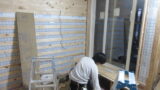 そして、K林工業のK林さんによる左官工事も本格的に始まりました。トイレの内部モザイクタイル貼りです。トイレ横のカウンター手洗いが取り付く部分です。クロスもそうですが、タイルも貼られることで、ぐっと雰囲気が変わってきますね。こちらも楽しみですね♪